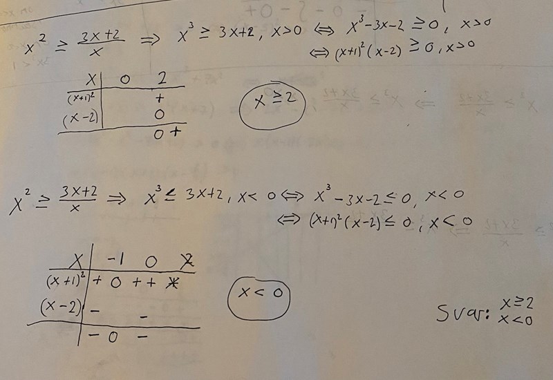 Hej, varför får jag inte alla lösningar med följande metod? Ser i ursprungsolikheten att x<0 också är en lösning men inte i teckentabellen