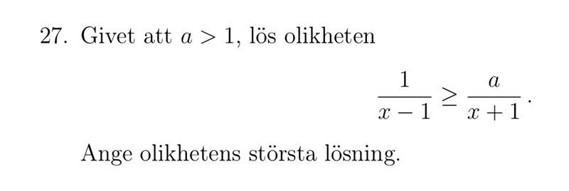 Jag har ingen arning hur jag ska angripa problemet. Det jag ser är att x inte får vara lika med 1 och -1. Sedan byter olikhetstecknet sida vid multiplikation eller division med ett negativt tal. Att multiplicera upp nämnarna vågar jag inte då jag inte vet om de är positiva eller negativa, olikhetstecknets riktning kanske riktas åt ett felaktigt håll. Jag testade i alla fall det men det ledde heller inte någon vart.