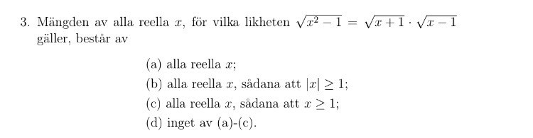 Plopp99 skrev :Så, om jag förstår dig rätt, mängden av alla reella x är ej korrekt beskriven av B) för då gäller ej olikheten vilket gör den till en felaktig lösning? Dvs, stoppar vi in x=-2 så blir det negativt under rottecknet. Alltså är inte mängden av alla reella x rätt beskriven av B.