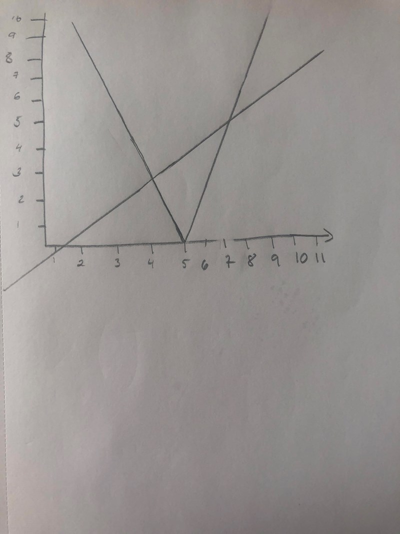 Då ser du två linjer som skär varandra i x=5 och där ska du bara bry dig om de delar av linjerna som ligger ovanför x-axeln