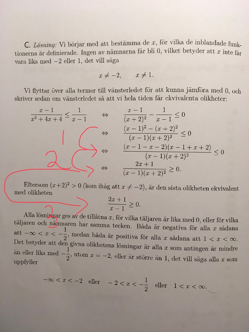 3. Antar att man multiplicerar med (x+2)^2 på båda sidorna på grund av att (x+2)^2 har fyllt sin funktion. Vi har all information som går att få ifrån den och den blir alltid större eller lika med noll, alltså aldrig negativ och därav påverkar inte termens tecken (som alltid är positivt) funktionens värde. Dock gör (x-1) detta eftersom olika värden på variabeln ”x” generar olika värden på termen, med olika tecken, vilket påverkar definitionsmängden på uttrycket som helhet då samma princip gäller i täljaren. Undersökningen som sedan följer förstår jag utan problem. Det jag undrar är i punkt 3 är; förstod jag detta delsteget i sin HELHET eller är jag helt fel ute?