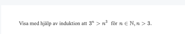 Eftersom vi garanterat vet att 3^p > p^3 (enligt antagandet) vet vi garanterat att 3 * 3^p > 3 * p^3. Jag utgår från antagandet. Alltså : visar jag att 3p^3 > (p+1)^3 vet jag även med säkerhet att 3^(p+1) är större än (p+1)^3. Förstår du mitt resonemang?