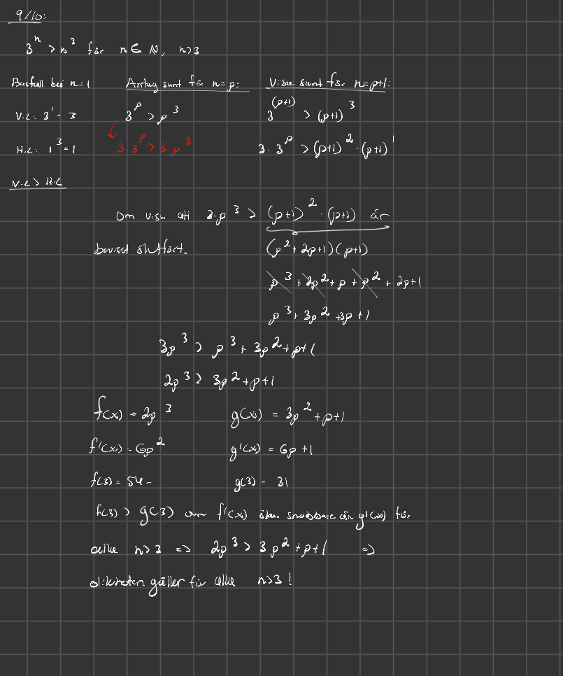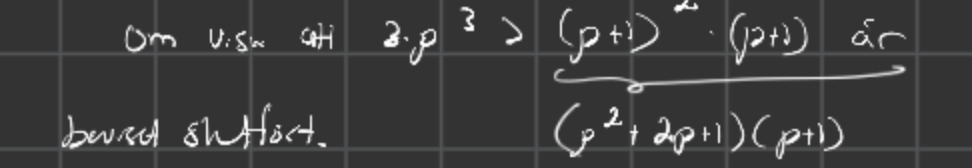 Anonym_15 skrev:Eftersom vi garanterat vet att 3^p > p^3 (enligt antagandet) vet vi garanterat att 3 * 3^p > 3 * p^3. Jag utgår från antagandet. Alltså : visar jag att 3p^3 > (p+1)^3 vet jag även med säkerhet att 3^(p+1) är större än (p+1)^3. Förstår du mitt resonemang?