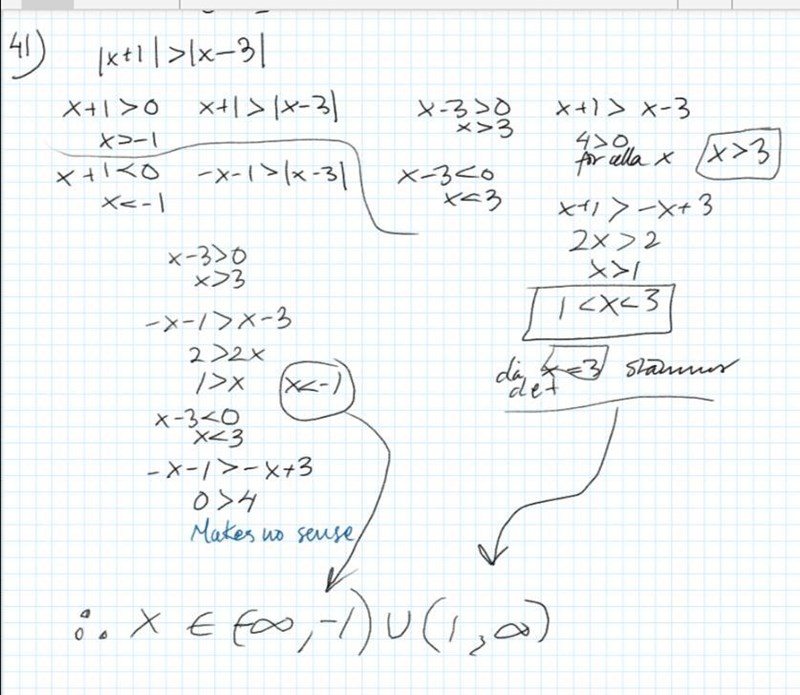 Kontrollera om det förbjudna värdet x=-1x = -1 uppfyller olikheten |x+1|>|x-3||x+1| > |x-3|: Nej det gör det inte, eftersom oavsett vad xx är så ska det alltid gälla att |x-3|0|x-3| \geq 0.
