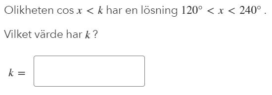 Logiken jag använde vad att jag letade för en lösning längst grafen cosx där cosx<k. Cos 120 och cos 240 var -0.5. Om ma drog en hypotetisk linje längst y=-0,5, då tänkte jag att jag måste hitta en lösning. Då tänkte jag att om det ska finnas en lösning där, då måste det vara -1.