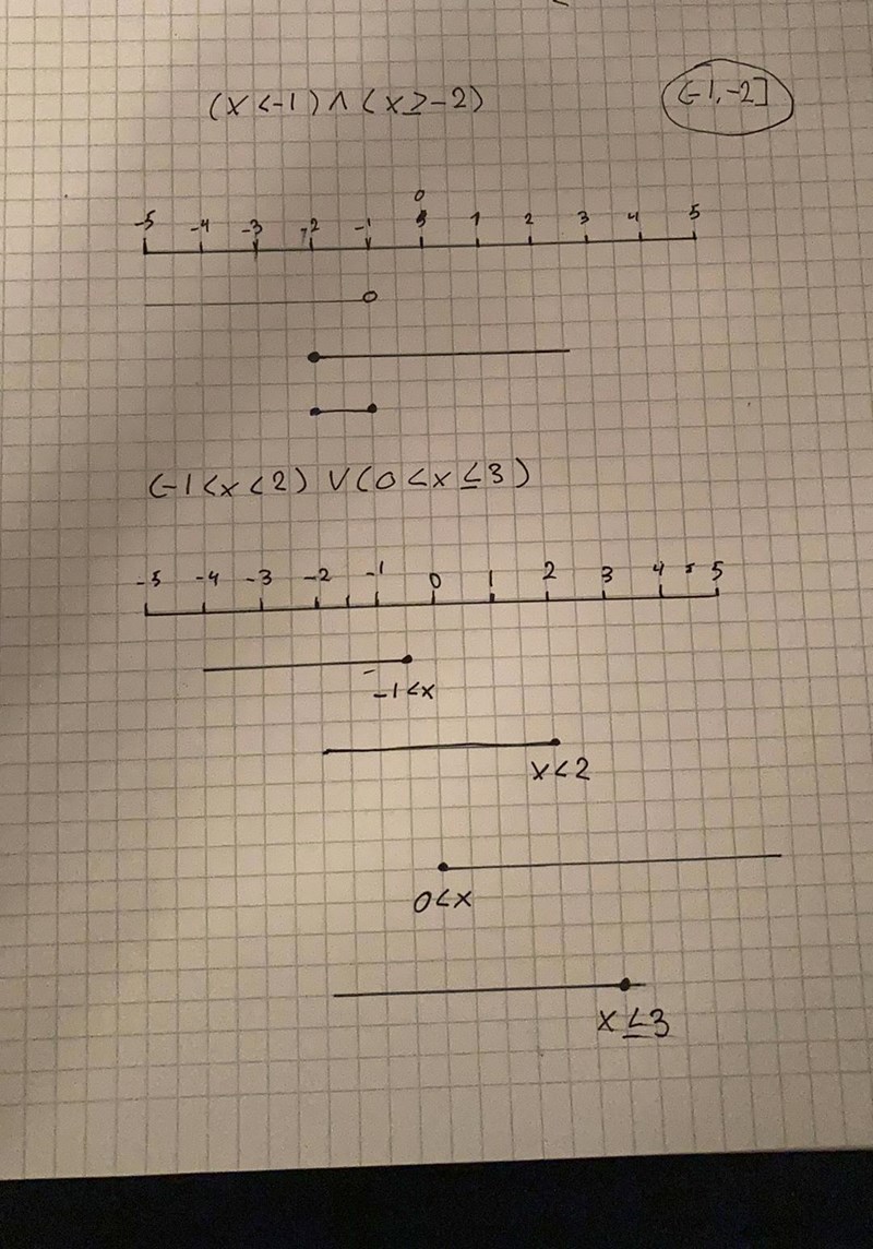 I min bok finns det ingen ritning för {x:(−1<x<2)∨(0<x≤3)}, dock finns det för  {x:(x<−1)∧(x≥−2)}. Jag har ritat  {x:(x<−1)∧(x≥−2)} så här: