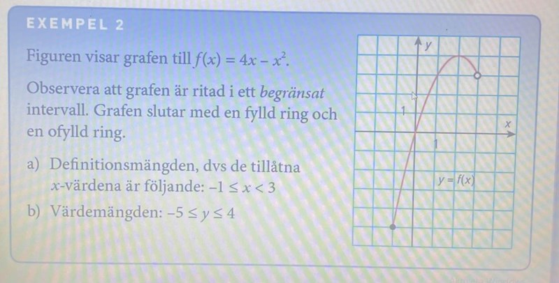 Jag undrar varför man inte har samma olikhetstecken på värdemängden, dvs man skriver att värdenmängden kan vara ,