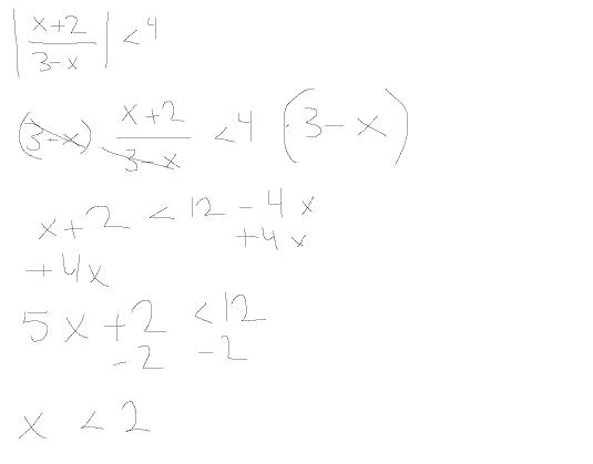 Här har jag ändrat tecken vid negativ, x<2 är fortfarande korrekt svar, men 14/3 > x är fel. Det ska vara 14/3 < x som är rätt.