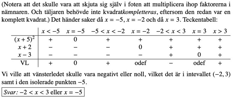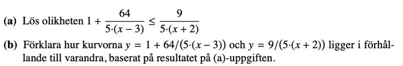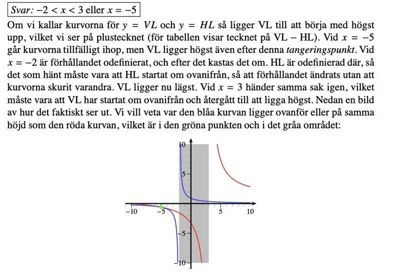 Jag har räknat ut till -2<x<3 och x=-5 (för att få 0 i täljare) svaret är rätt med facit men jag förstår inte b jag har svar på a men hur ska jag svara på b i facit står detta som svar men tycker dom förklarar mycket komplicerat så jag inte förstår något alls. om jag hittar nollställe i täljare som nu är -5 betyder det att kurvorna ALLTID skär där eftersom det nollställen är tagen i täljaren?