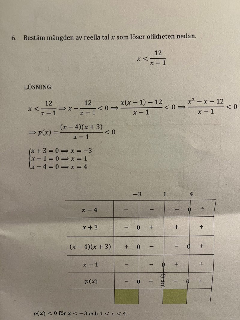 Spelar det någon roll vilket av leden jag väljer att flytta på? Jag valde att skriva om uttrycket till 12/x-1 > x sen flytta på x till vänster ledet och byta tecken. Då blir det (12/x-1)-x >0. Problemet blir att jag får -3<x<1 och x> 4 som svar. Det skiljer sig från facit som ni ser på bilden. Varför blir det fel fastän att jag bara skriver om ursprungliga uttrycket?