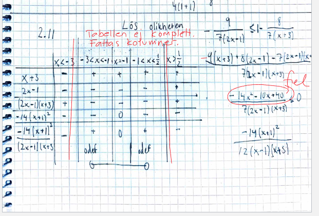 Den vågräta översta raden ska täcka hela reella axeln. Du har glömt kolumner för värdena x=-3 och x=1/2. Genom att uppfylla detta krav kan examinatorn t ex se om du förstått skillnaden mellan nollställe och singularitet. I allmänhet kan en fkn också vara diskontinuerlig även i en icke-singulär punkt. (Dock ej i detta fall).