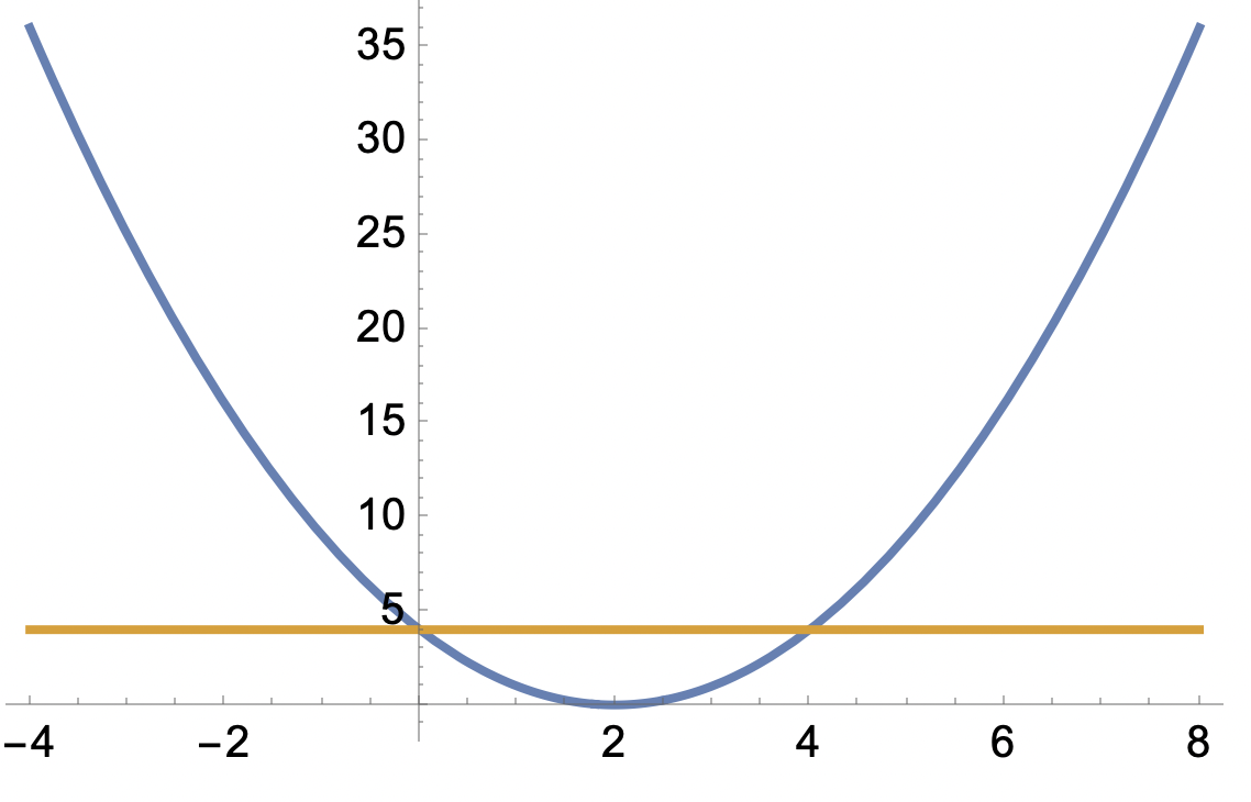 Börja med att lösa ekvationen (x-2)2 =4, vilket ger dig lösningarna x1 = 0 och x2 = 4.