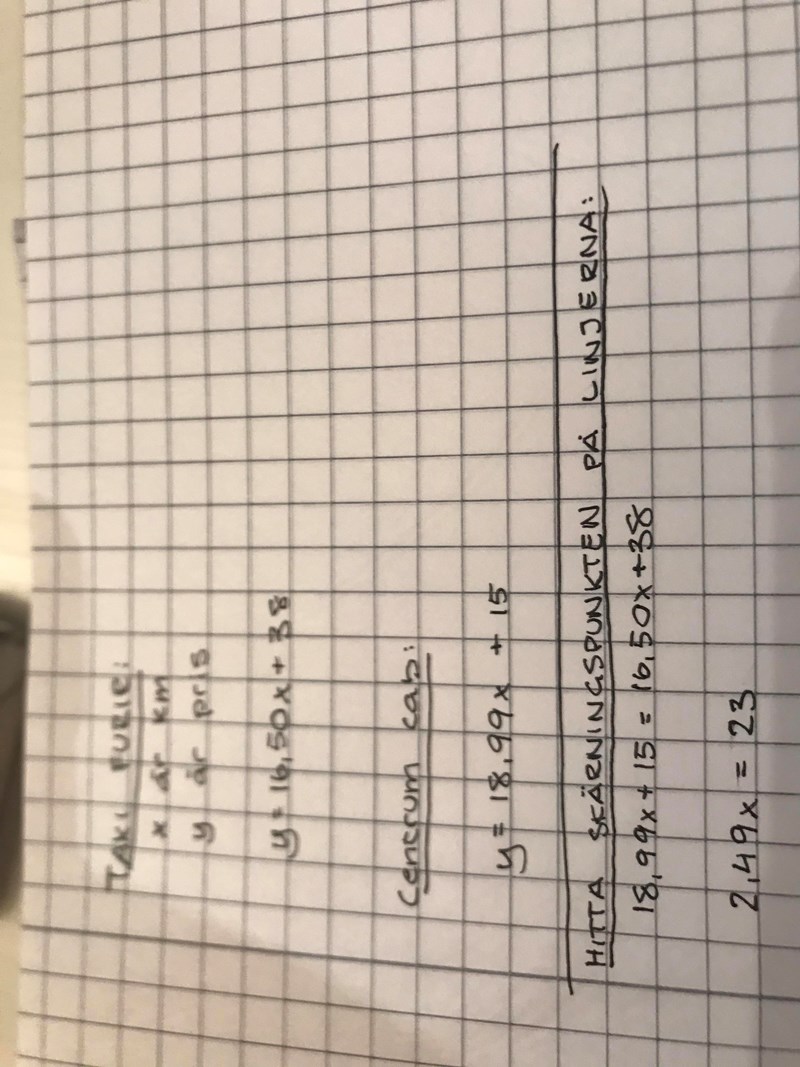 Att åka Taxi Furir kostar en vardag 38 kr i grundavgift och 16,50 kr/km. Centrum Cab tar 15 kr i öppningsavgift och 18,99 kr/km. För vilka sträckor är det billigast att åka med Taxi Furir?