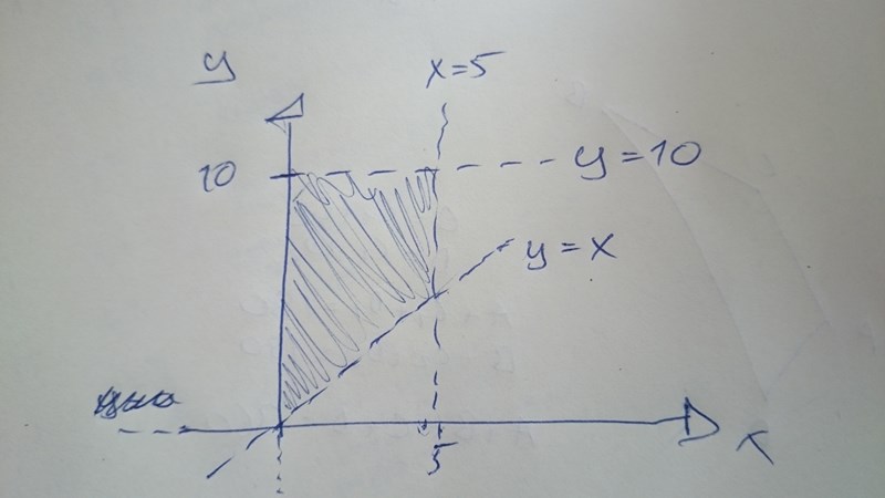 Om.du villkan du rita det tillåtna området för x och y genom att i ett koordinatsystem rita begränsningslinjerna x = 0, x = 5, y = x och y = 10.