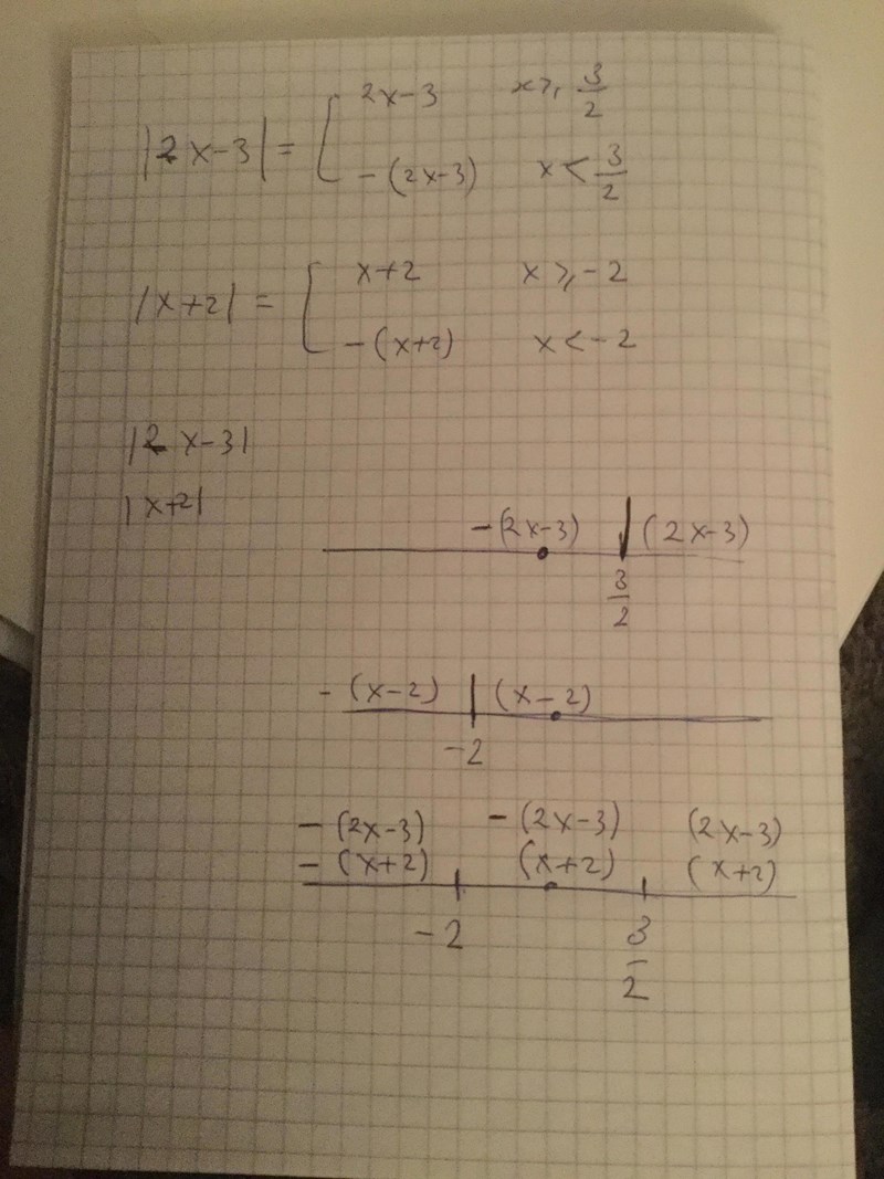 |2x-3|= -(2x-3). |x+2|= x+2. -2x+3<x+2. 1<3x. X>1/3 ok
