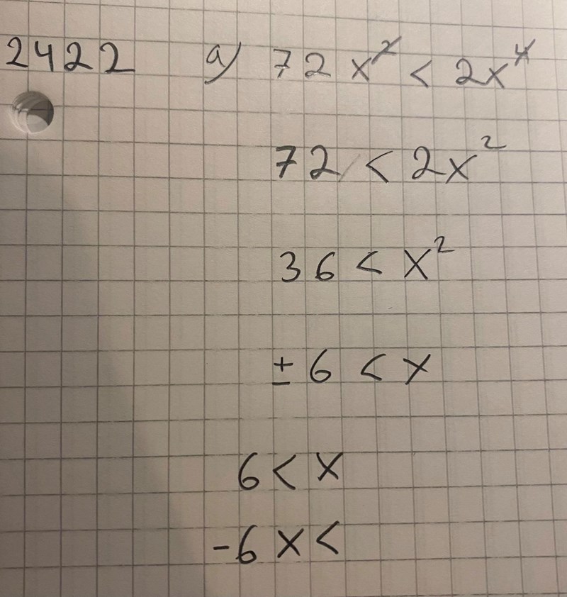 6 < x på näst sista raden är jag med på, det kan skrivas som x > 6