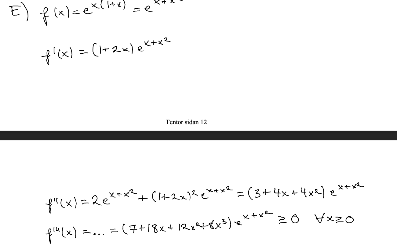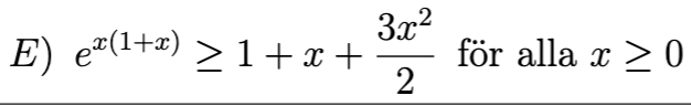 Man kan göra som du, utv x(x+1) och ta det som inargument till serien för e^x. Dock tror jag man bör öva "multiplikation" som jag visar ovan då provkonstruktörer älskar hitta på de mest patologiska produkter och kvoter vars gränsvärde skall bestämmas. Det krävs lite övning i att multiplicera polynom och resttermer "så det går undan" (det mesta försvinner när gradtalet ökar bortom rim och reson) så det kan vara bra om du övar på det också. 98% av alla termer kan man "kasta bort" (eller gruppera i en ny restterm) och det är denna "känsla" som är bra att öva in. Notera hur jag (pedagogiskt) börjar med att skriva produkterna men på slutet slänger jag bara till med R(x) eftersom alla de produkterna har högre gradtal än 2.