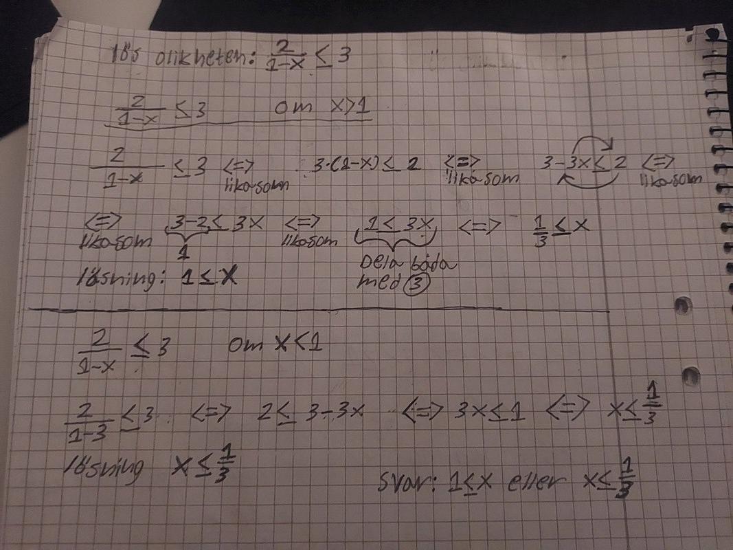 Fall 1: Det är lite rörigt att du multiplicerr med 1-x, vänder på olikhetstecknet och byter plats på HL och VL i samma steg utan att berätta vad det är du gör. Du behöver också berätta varför du tar bort 1/3 < x < 1 från lösningsmängden.