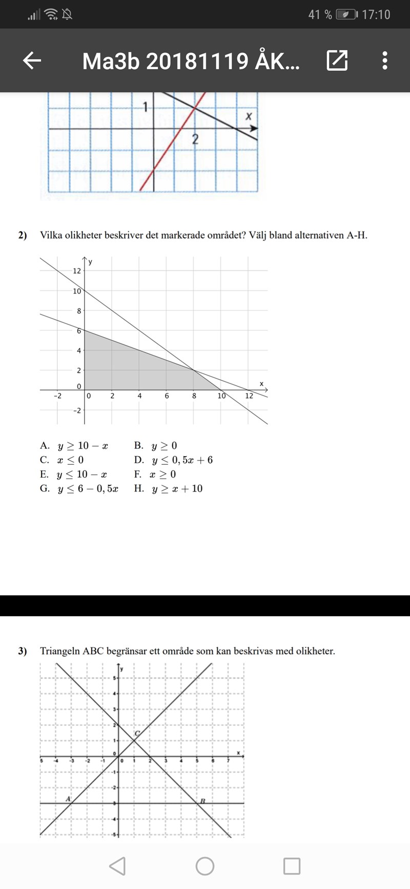 Angående första frågan: Vilka ekvationer har linjerna? Om du beskriver området med ord, hur skulle du beskriva det?