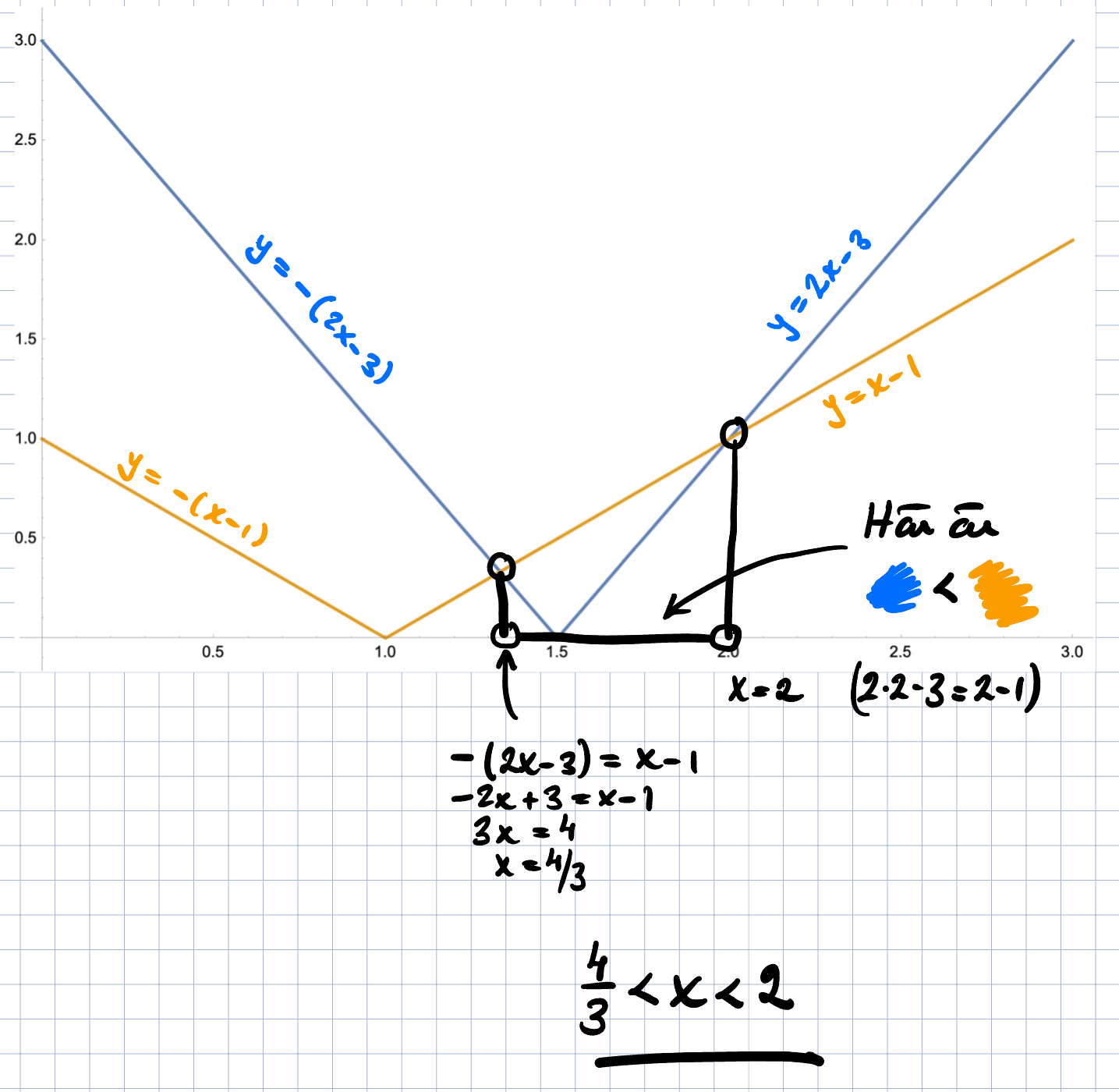 - Intervall 3: . Här är |2x-3| = 2x-3 och |1-x| = -(1-x)