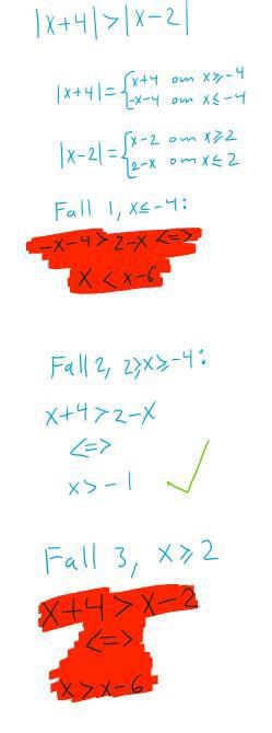 Fall 1. Här är och olikheten säger att avståndet mellan och -4 är större än avståndet mellan och 2. Detta är förstås nonsens, varför olikheten saknar lösningar på intervallet .