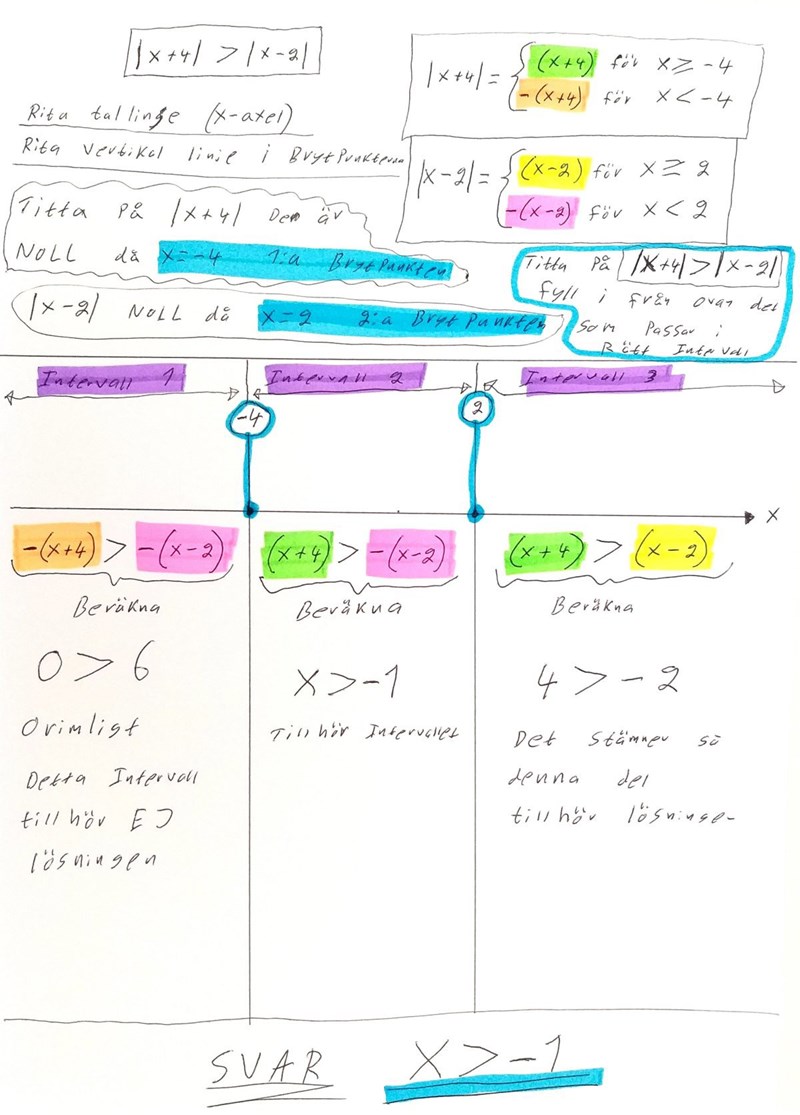 Altså: Intervall 1 tillhör Ej Lösningen. Första halvan av Intervall 2 tillhör Ej lösningen, men andra halvan av Intervall 2 X>-1 tillhör lösningen. samt Intervall 3