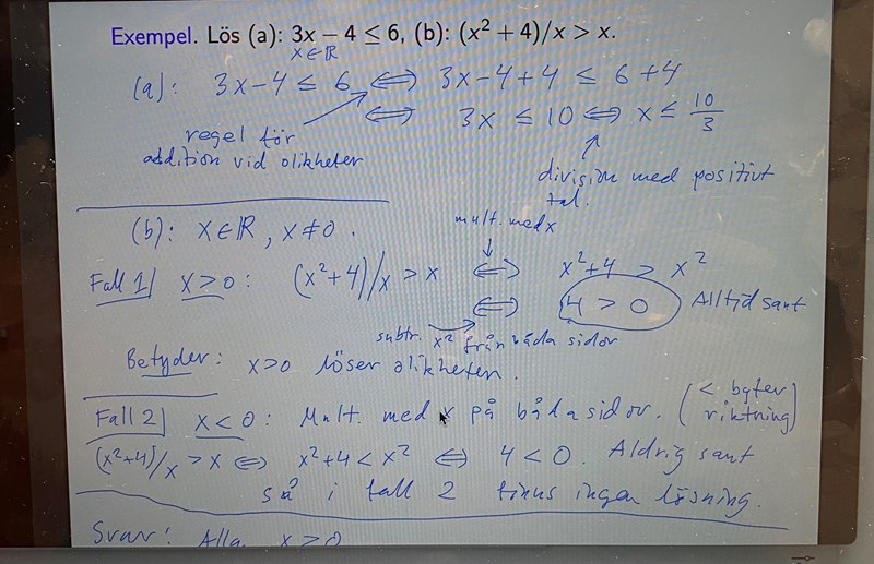 Hej! Jag undrar hur man tänker på uppgift b. Jag förstår inte min lärares uträkning…. Vad menar han med att 4>0 så innebär det att x>0? Tack på förhand!!!