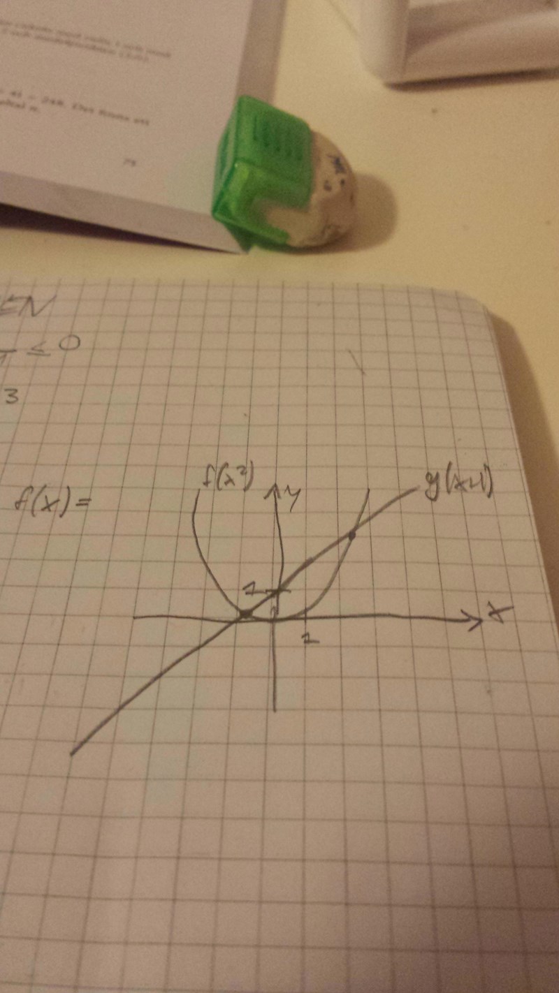 Eftersom f(x)=x+1 och g(x)=x^2 är kontinuerliga funktioner, behöver vi enbart undersöka hur de förhåller sig till varandra mellan de värden då de är lika.