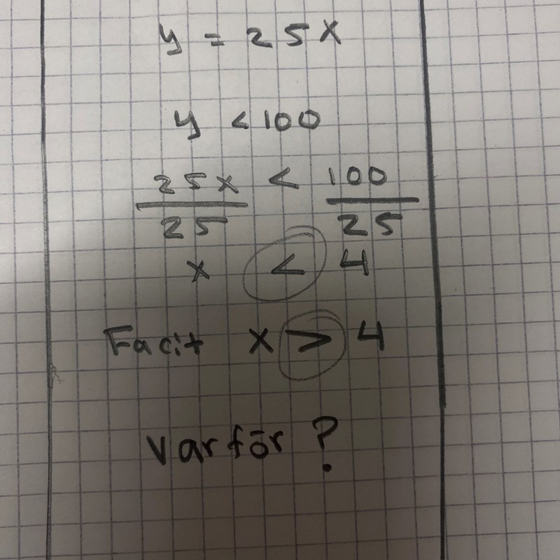 I uppgiften frågar de efter lösningen till olikheten y > 100 medan du råkat skriva av y < 100