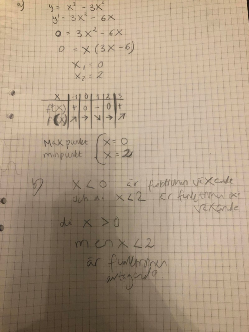 0 < 3x(x-2), här vet jag att x>2 och att x<0. Men i facit har har använt dessa tecken . Det är alltså samma men enligt facit kan x också vara =2 eller =0, problemet är att om man sätter in t.ex. x=2 i derivatan får man att lutningen är 0 och då når man funktionens extrempunkt så varför har man i facit antagit att den växer även då?