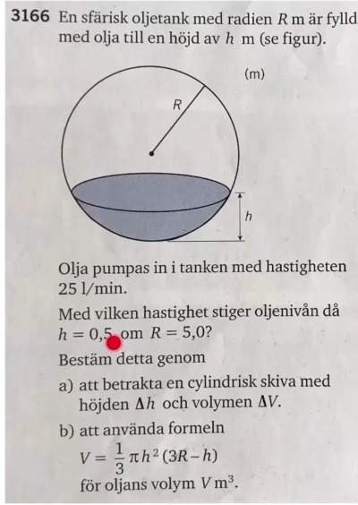 Du måste hitta ett uttryck för hur snabbt vätskehöjden i tanken ökar som funktion av tiden, dvs . Uppgiften ger dig hur snabbt man pumpar in olja i tanken, dvs . Vilket samband finns mellan och ?