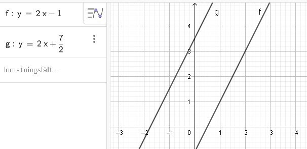Här ser man direkt att ingen punkt uppfyller bägge sambanden. Linjerna lutar exakt lika mycket men ligger en bit från varandra.