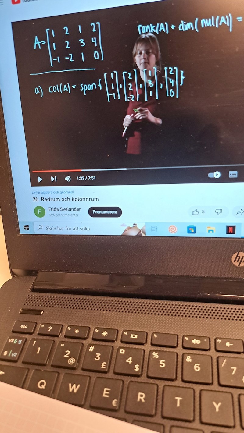 Så i uppgiften har vi A =3x4 men B är typ n×1 och då måste B vara 4x1 för att matris ska fungera ? Det är alltså därför hon säger att fyra kolonner ej kan utgöra en bas utan det måste alltså vara 1 kolon,2 ,3 eller hur? Då kan vi säga direkt att 3×1 matris utgör R^3