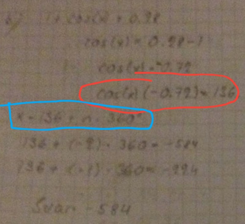 Hej. Det finns ett villkor avseende vilket intervall man ska hitta lösningen i som du inte har skrivit ut. Så det går inte att avgöra om -584° är rätt svar.