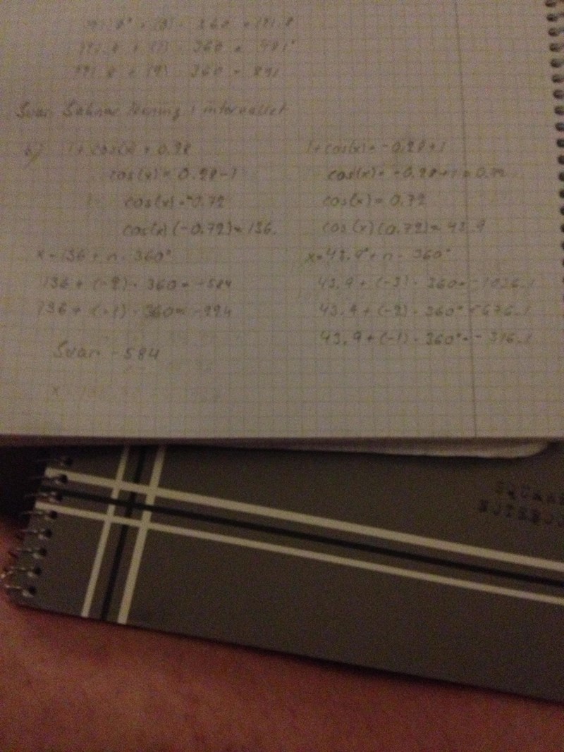 På begäran. Uppgiften gällde att hitta alla lösningar (avrundat till hela grader) till ekvationen 1 + cos(x) = 0,28 där x ligger i intervallet .