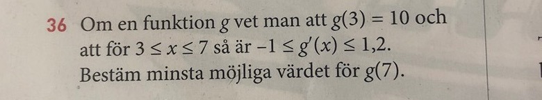min g(7) = g(3) + minsta derivatan i intervallet*längden på intervallet