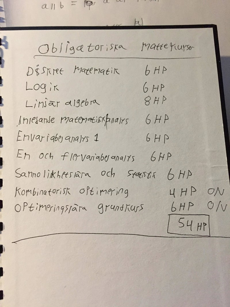 Jag har bara skrivit upp de obligatoriska kurserna inom matematik men en lista på alla kurser finner ni nedanför.
