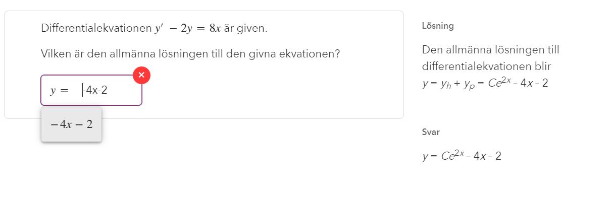 Vi vet sedan genom prövning att en inhomogen partikulär lösning kan skrivas y=-4x-2, men den allmänna skulle även få ett extra värde som beror av vi vet att den inhomogena lösningen skär x axeln vid den homogena lösningen, värde som kan variera, som även beror på x.