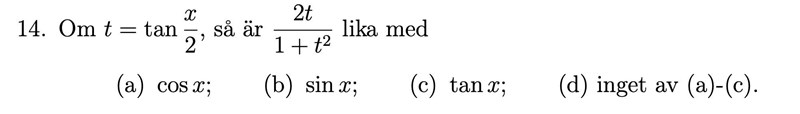 Om t = tan(x/2) så är 2t/(1+t^2) lika med?