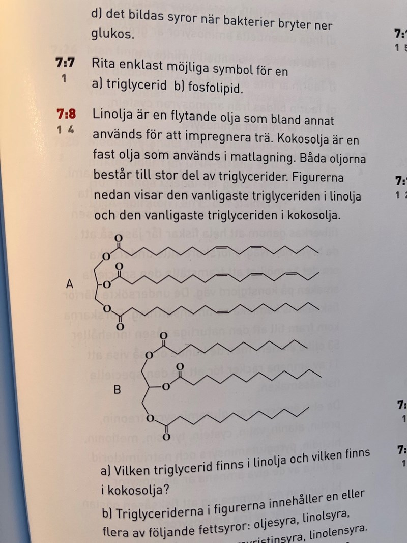Jag funderar över 7.8 a. Där känns det rimligt att triglyceriden B finns i kokosolja eftersom den är mättad och därav har högre smältpunkt. Kokosolja är ju mer fast än linolja vilket borde innebära att kokosolja är mer mättat. Ändå står det i facit att triglycerid B är linolja, är det fel i facit eller har jag tänkt galet?