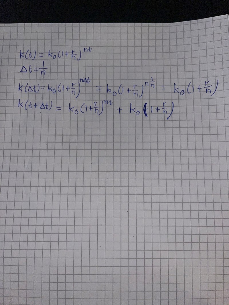 Försöker lösa en uppgift som handlar om kontinuerlig ränta. Jag har gjort alla stegen i uppgiften fram till den som är "mer avancerat". Jag förstår inte hur detta ska bli en differentialekvation när vi visar att förändringen av tiden går mot noll.