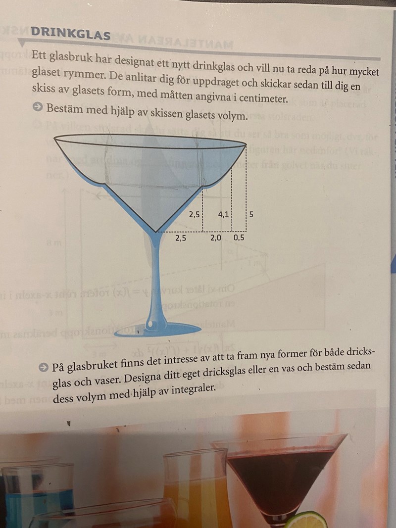 Hej, skulle behöva hjälp med nedanstående fråga. Vet inte riktigt hur jag ska lösa den. Tänkte först att man delar upp den i fyra olika dela: 1st kon, 1st mittendel o 2st sidodelar. Jag tänker att konens volym kan hittas med lämplig formel, men är inte riktigt säker på vilket sätt man hade använt rotationsvolymsformeln för att hitta de andra delarna. Tack i förväg!