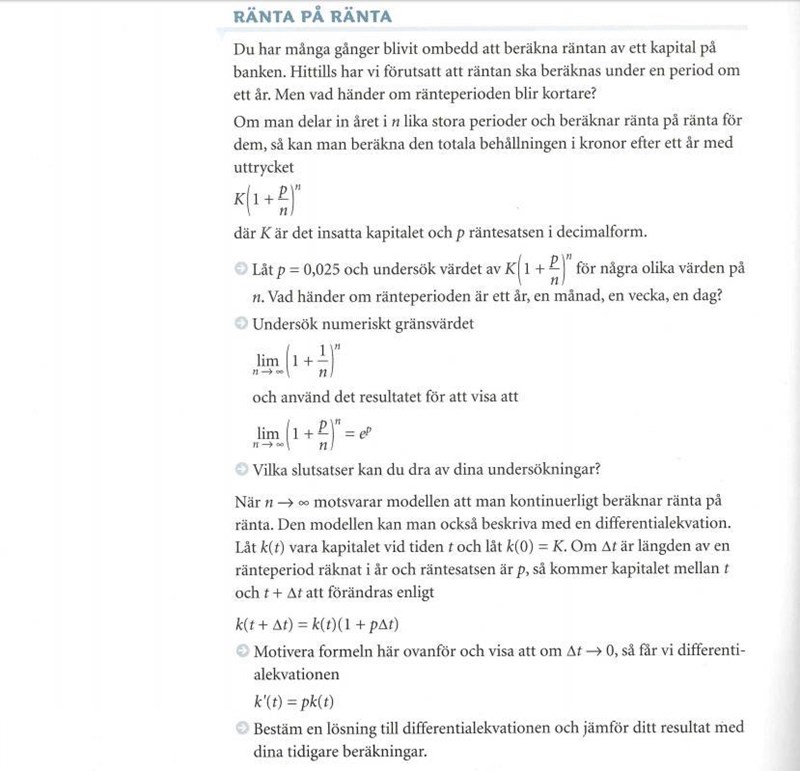 K(1 + p/n)upphöjd n där K är det insatta kapitalet och p räntesatsen i decimalform. Låt p=0,025 undersök värdet av uttrycket ovan. Vad händer om ränteperioden ett år, en månad, en vecka, en dag?