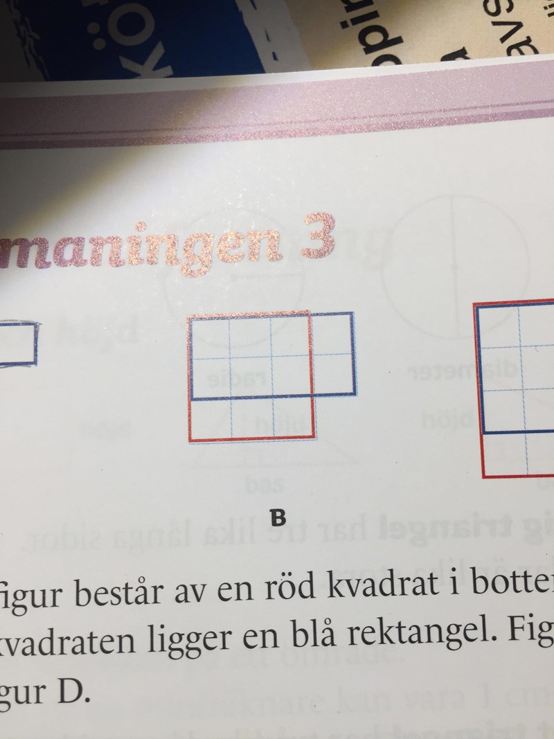 Uppgiften är ” varje figur består av en röd kvadrat i botten. Över kvadraten ligger en blå rektangel. ”