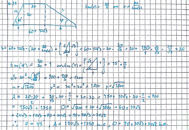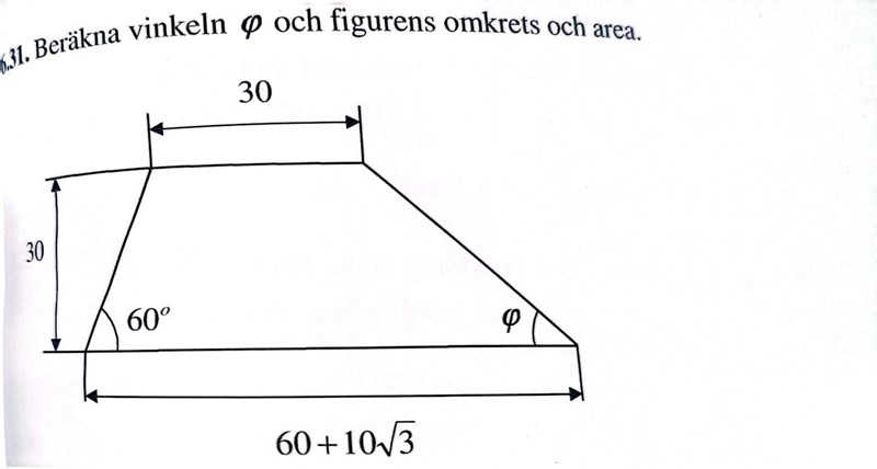 Hej vinkeln och arean blev rätt men facit säger att omkretsen ska vara 120 + 30*sqrt(2) + 10*sqrt(3) l.e. Förstår inte vad som gått snett.