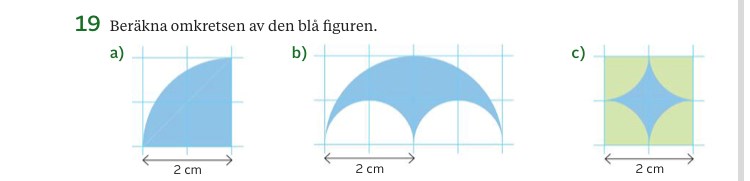 a) är en kvartscirkel! Om a) hade varit en hel cirkel med radien 2 cm, vilken omkrets hade cirkeln haft? :)