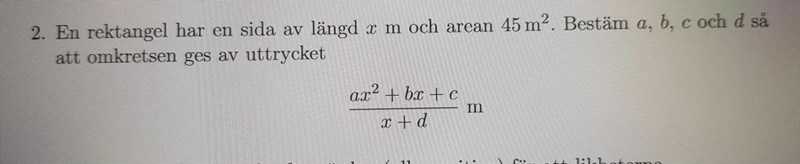 Det här var en helt annan uppgift än den du skrev i ditt förstainlägg: dels står det ingenting om att a, b c och d skall vara sidor i rektangeln, dels är det ett helt annat uttryck för omkretsen än det som du har skrivit - det du har skrivit i förstainlägget betyder . Om du vill skriva något som betyder samma sak som det står i uttrycket så behöver du sätta parenteser runt både täljaren och nämnaren, d v s (ax2+bx+c)/(x+d).