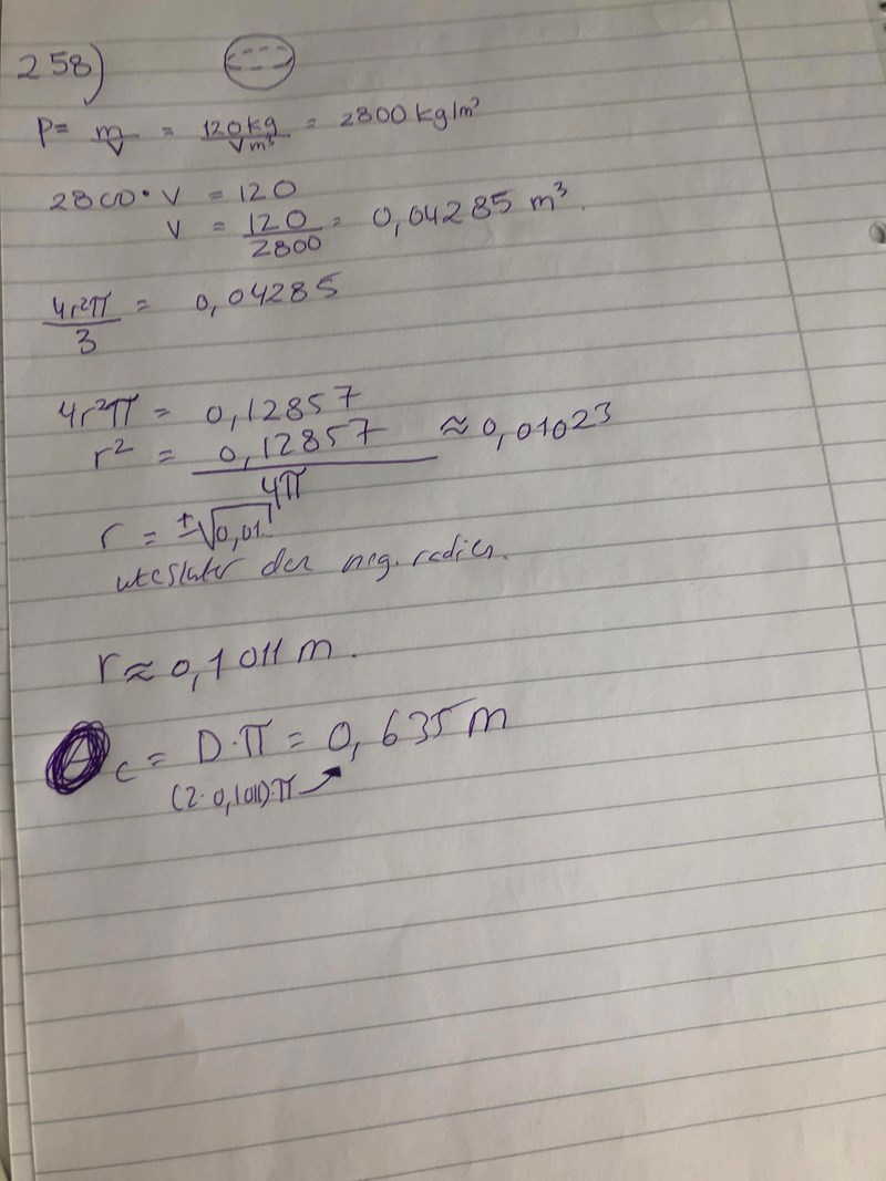 Något är helt galet när jag beräknar omkretsen av stenen som väger 120kg. Jag får svaret till 0.635m vilket inte stämmer överens med Facits svar.