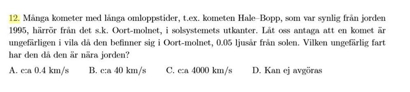 HT-Borås skrev :Kometen rör sig runt solen, men i en väldigt långsträckt ellipsbana. Eftersom den påverkas i stort sett bara av gravitationskraften från solen, som är en centralkraft, och rörelsemängdsmomentet då blir konstant, kan man dra vissa slutsatser om hastigheten.