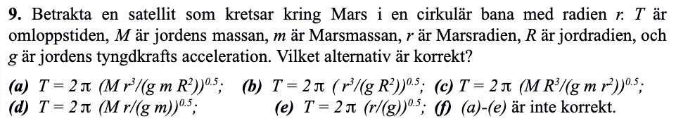 Försöker lösa denna men förstår inte hur jag skall tänka. Har försökt komma fram till något samband mellan tyngdaccelerationen på Mars och på Jorden, men verkar bli fel. Tänker också att man kan använda Keplers tredje lag. Hur skall man tänka?